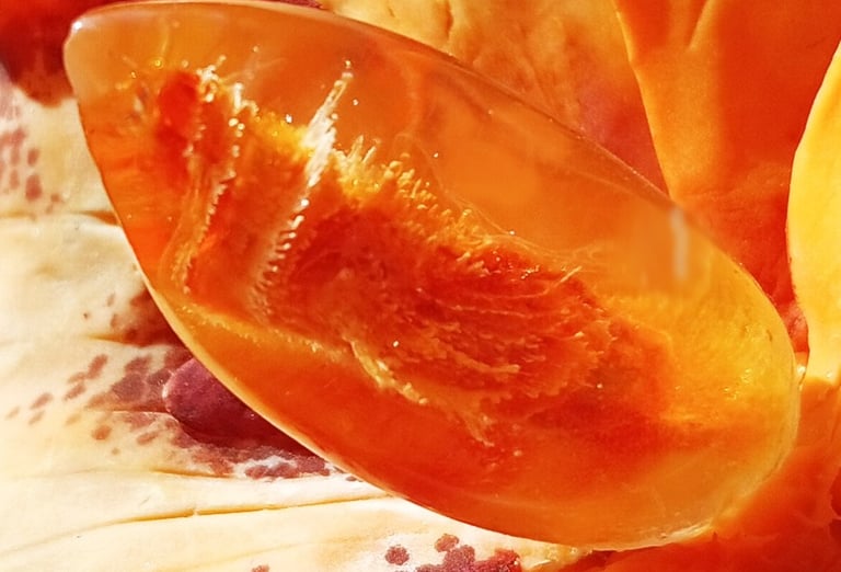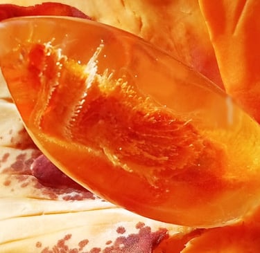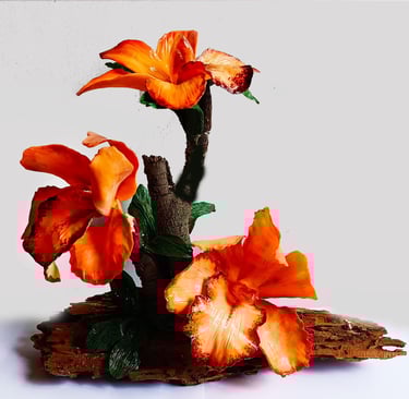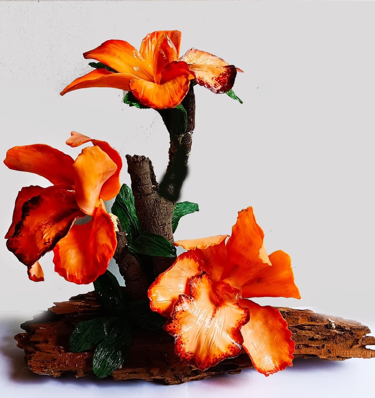 "Orange Orchids" have an epoxy pistil which I made earlier and leaves made from cold porcelain clay, the only clay that can get as thin as a flower petal. The logs were found beside the road on one of my morning walks. I've got an absurd amount of pretty logs, which are NOT junk-they are beautiful! Poems are made by fools like me, but only God can make a tree, right? And only time can carve them into those organic shapes.