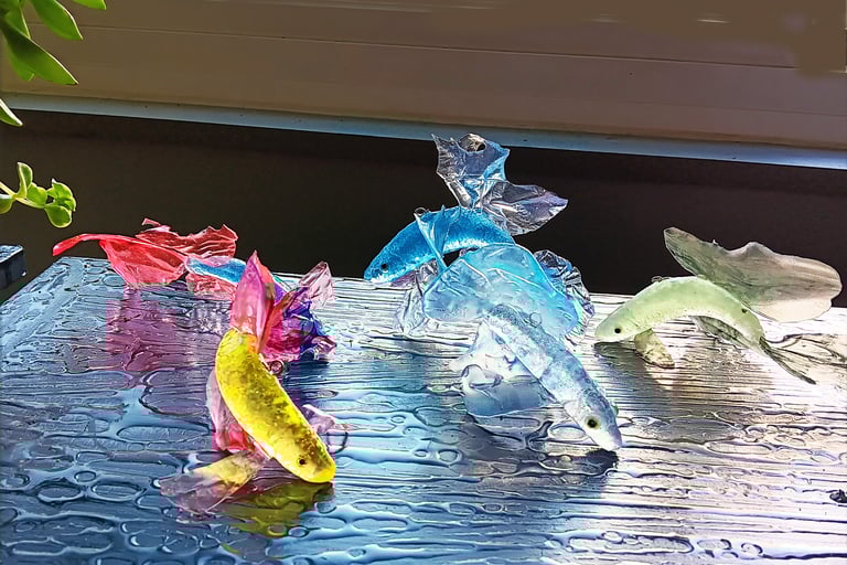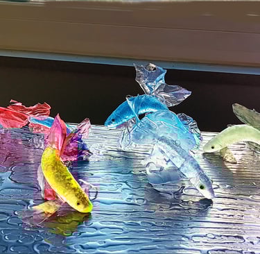 I am an artist and rather obsessed with 'seeing through.' So I made these Glimmer Fish. They look like colored glass and their colors change depending on your perspective. Fins are see-through, right?. I'm working on a dragonfly today. Look at a dragonfly's eyes! Enjoy their irridescence. A glimmer...the world is full of them.